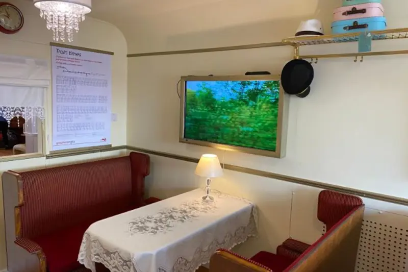 • The Corner Lodge Express, a purpose-built train carriage with 3 monitors connected to a video feed that simulates views from the window of a moving train.