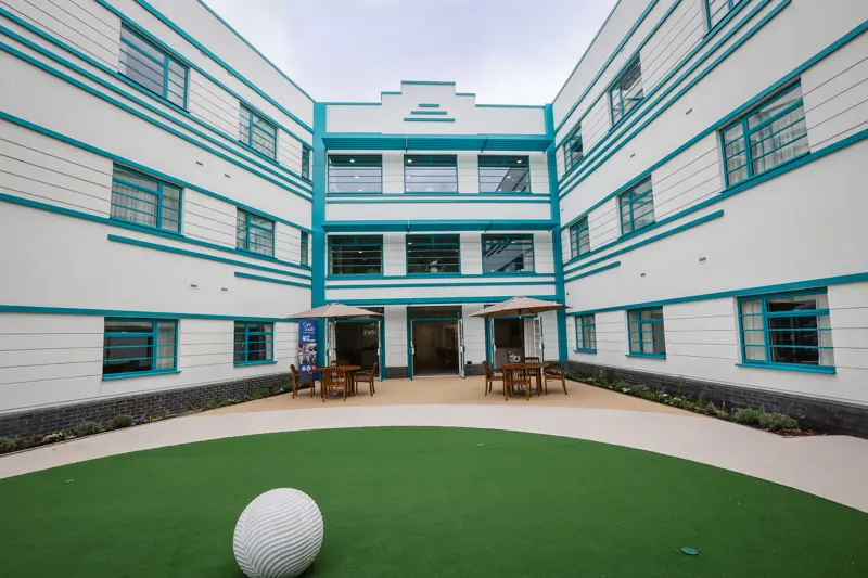 Purpose-built in the style of Art Deco to complement the local environment, Marjorie House has 50 ensuite bedrooms, including double rooms. Each room has been built with both comfort and space in mind with built-in wardrobe, television, armchair, separate ensuite with shower, basin and toilet.