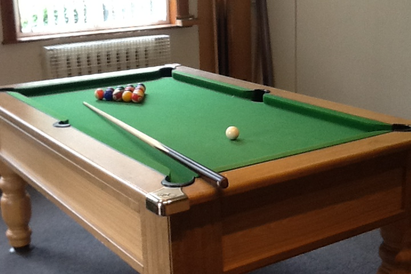 A Games Room with pool table, computer games and snack machine.