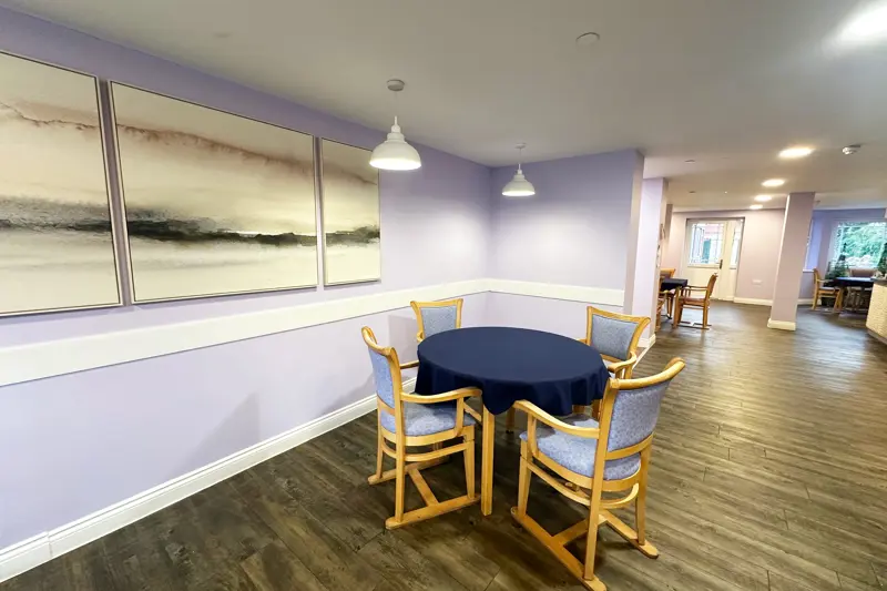 The home is thoughtfully arranged across multiple floors with spacious en-suite bedrooms that residents are encouraged to personalise with their own belongings, helping to create a familiar and reassuring space. Each floor features dedicated communal lunges and dining rooms, offering opportunities for social connection as well as quieter corners for relaxation. Outdoor access to peaceful gardens and patios further enhance resident wellbeing.